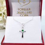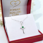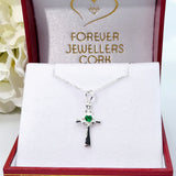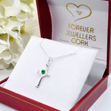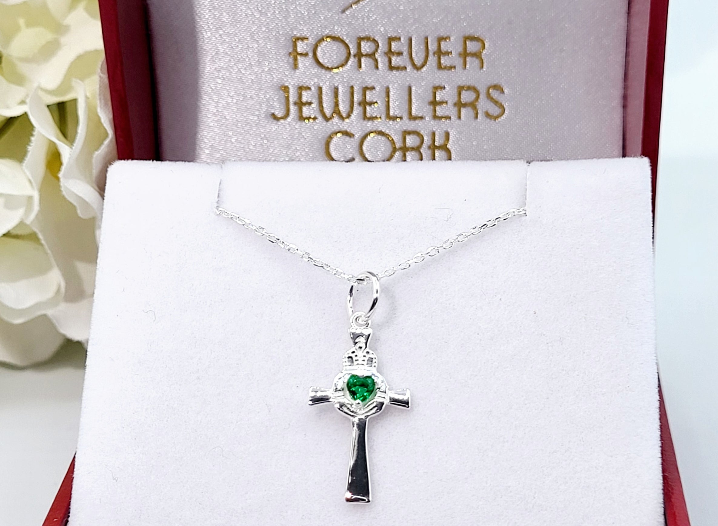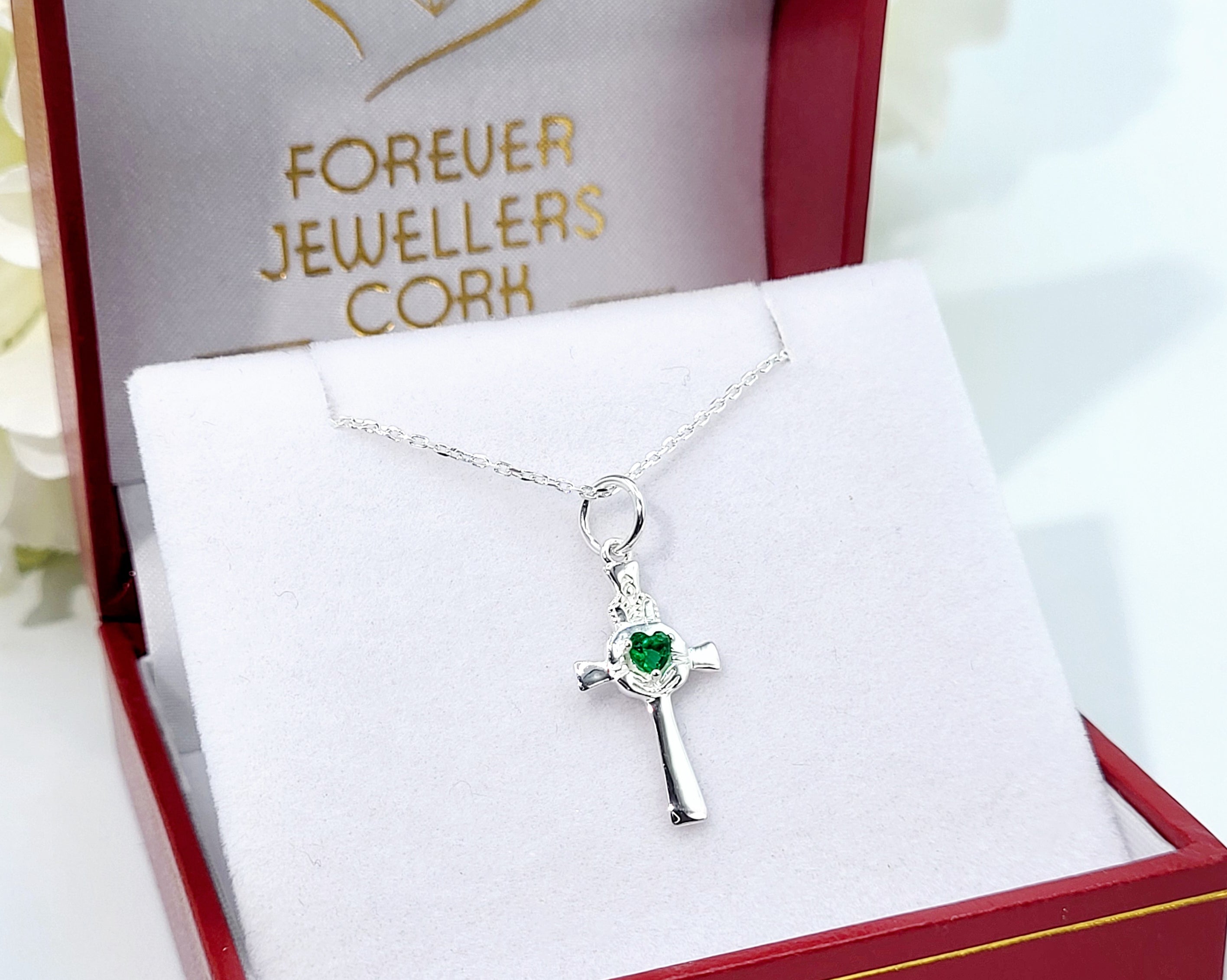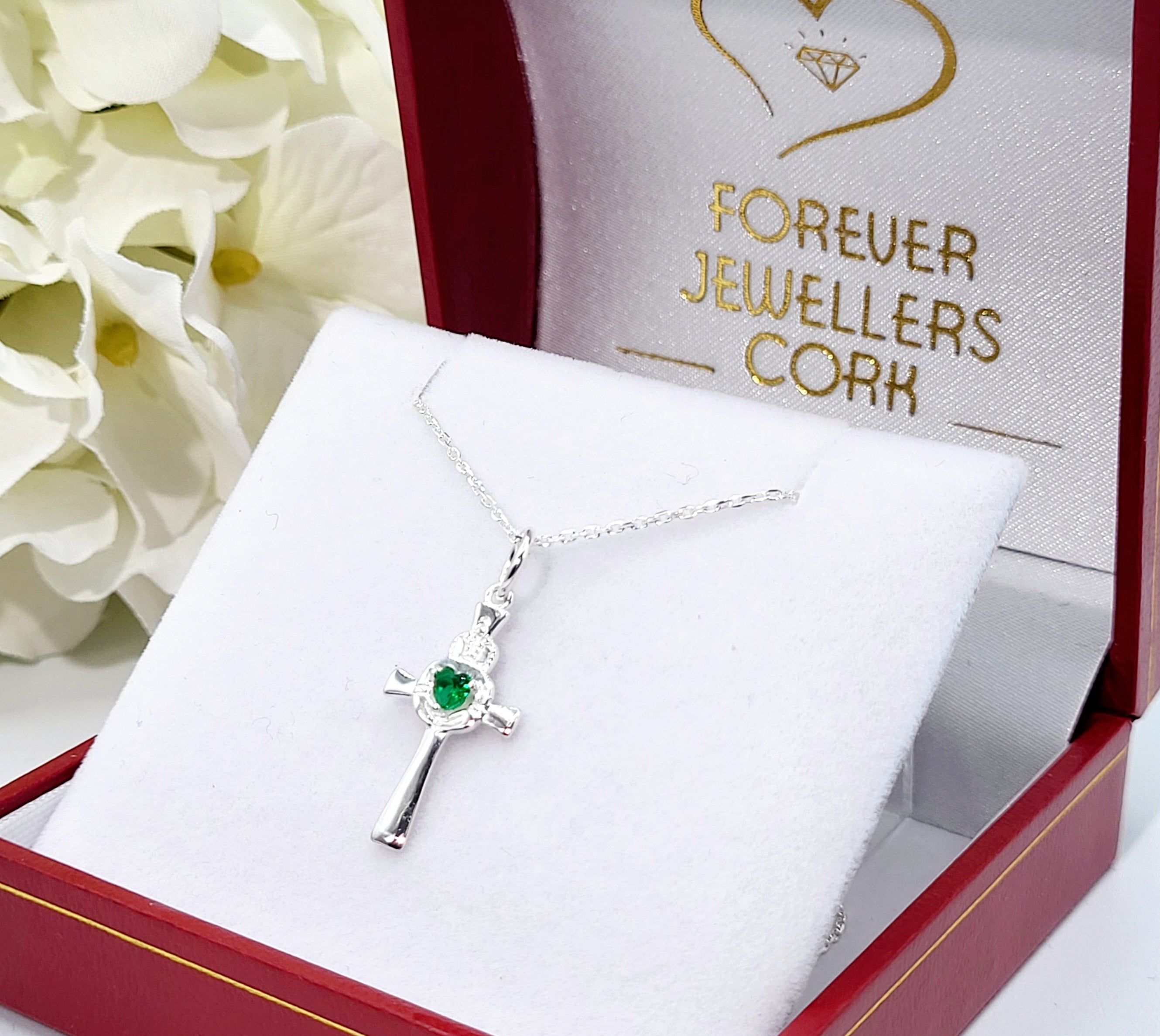 Sterling Silver Emerald CZ Claddagh Cross & Chain